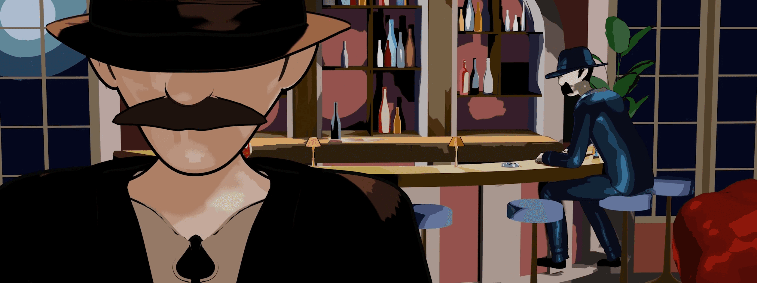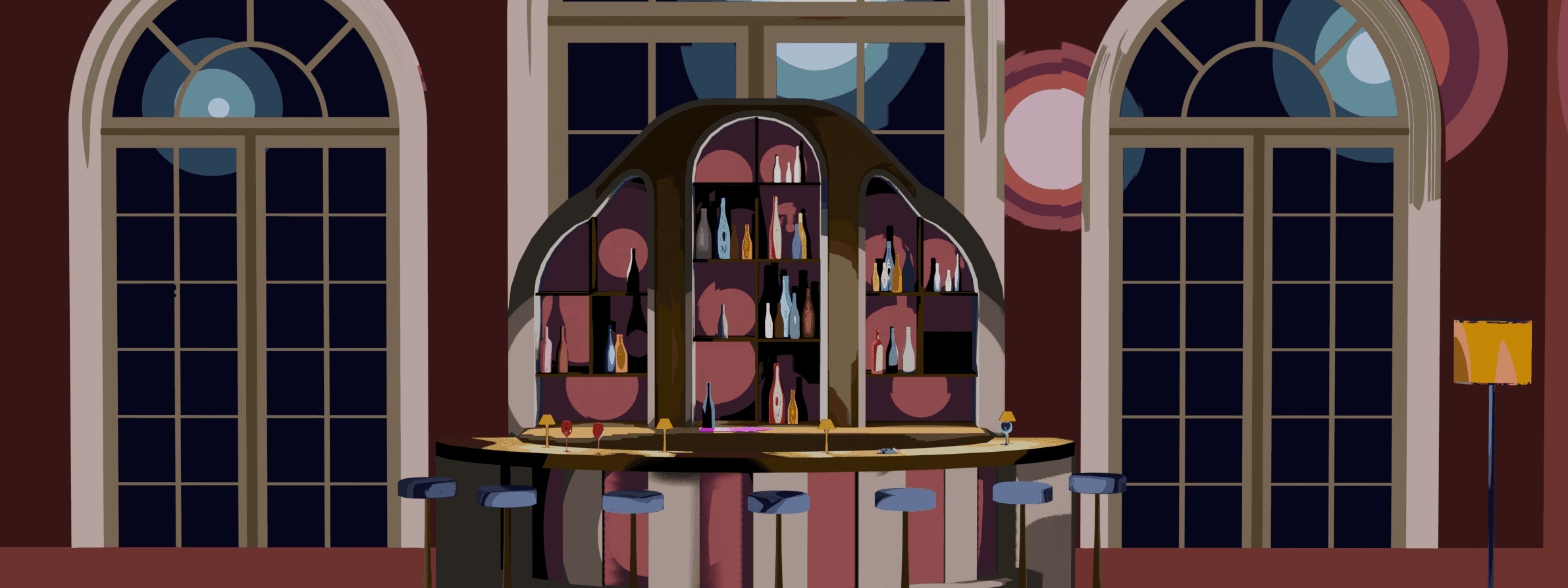 Secondly, we have the bar, in which the action in the "Card World" begins. This bar was modeled with the purpose of representing an old cartoonish bar with a corolful theme and vintage feel. The third and final setting is the maze that connects these two worlds. Both the bar and the maze's final renders use shaders to mantain the cartoonish look of the card world, where the protagonists are the King, the Queen and the Jack.