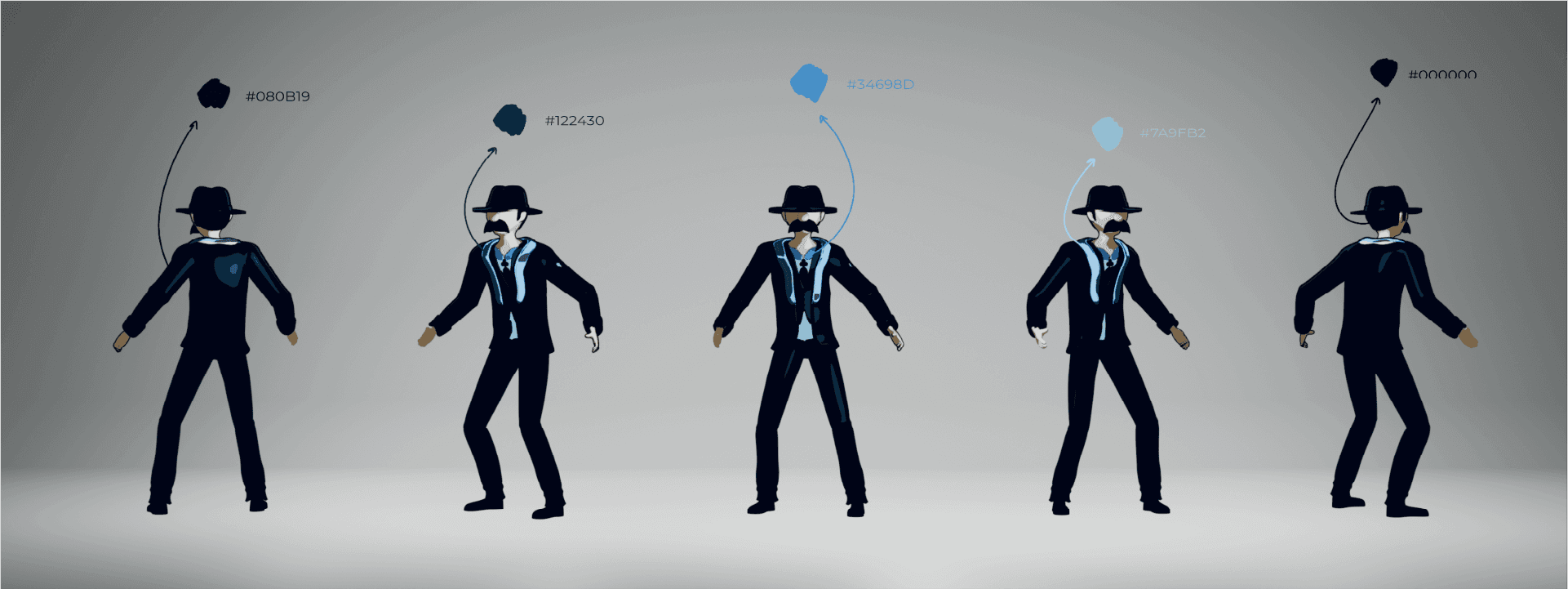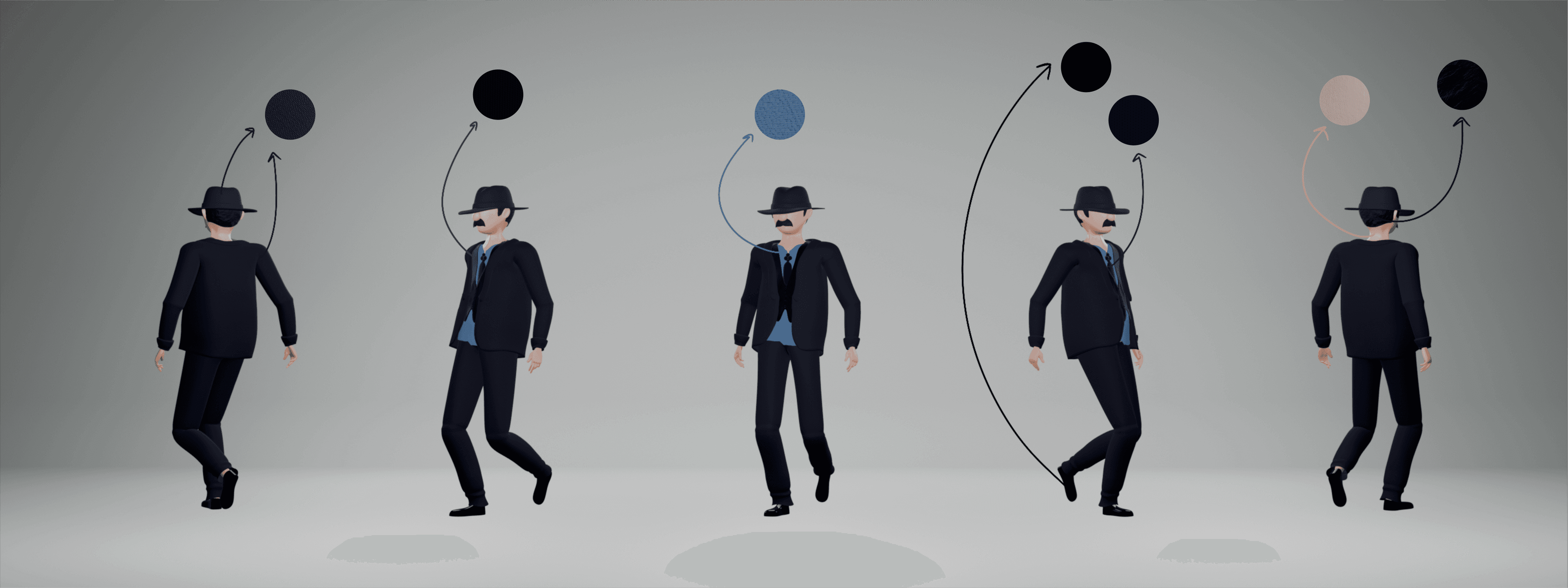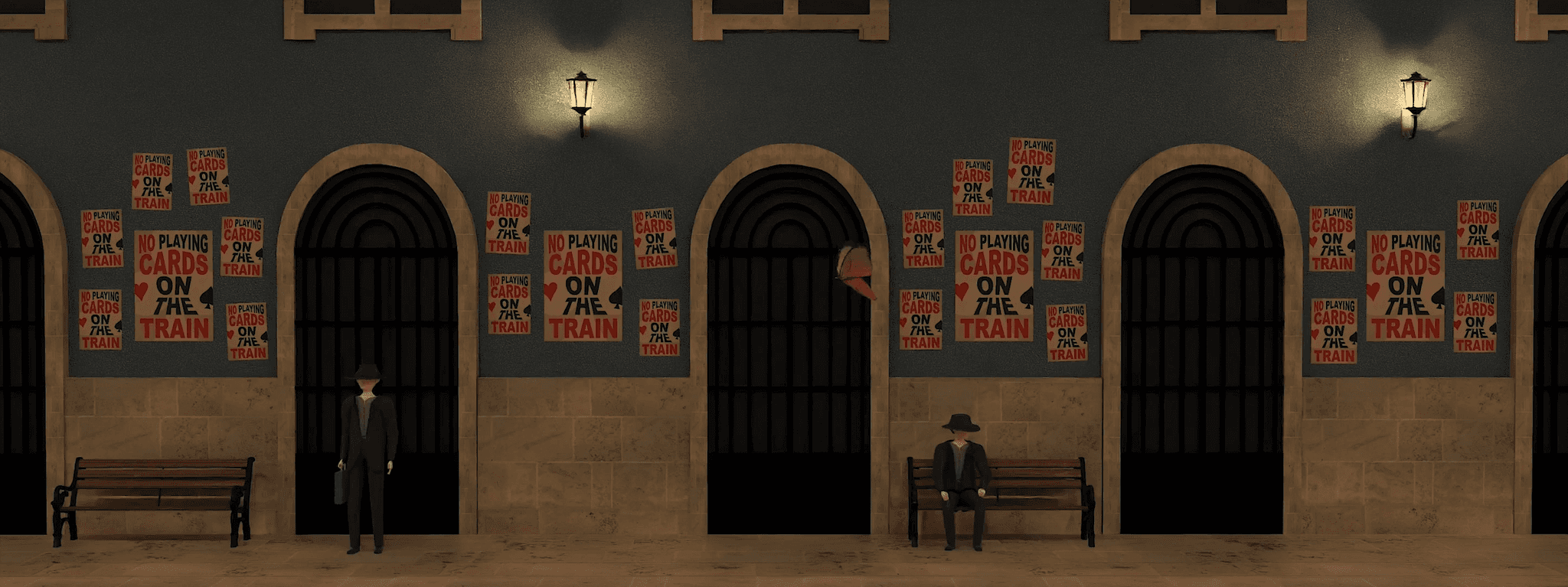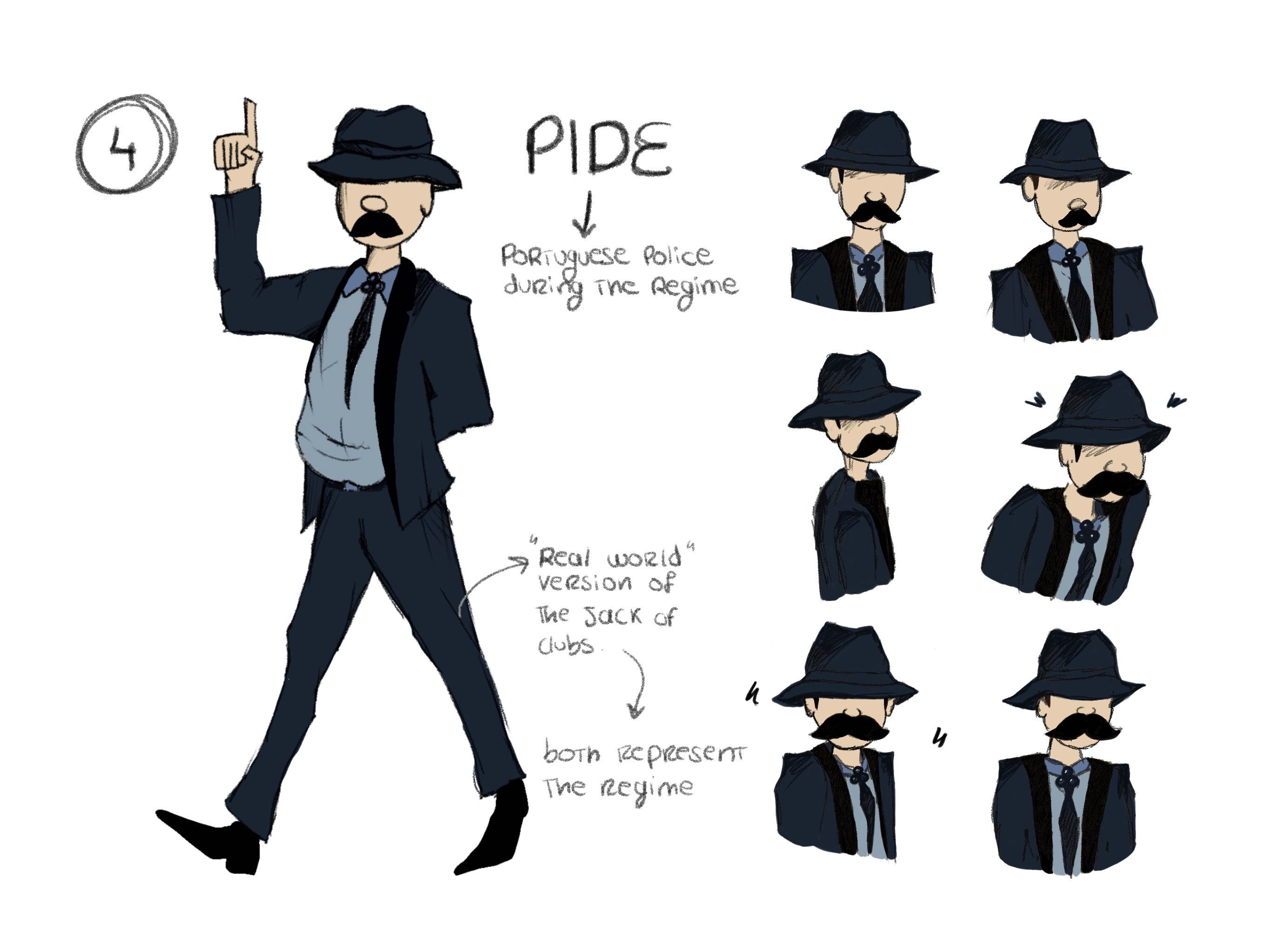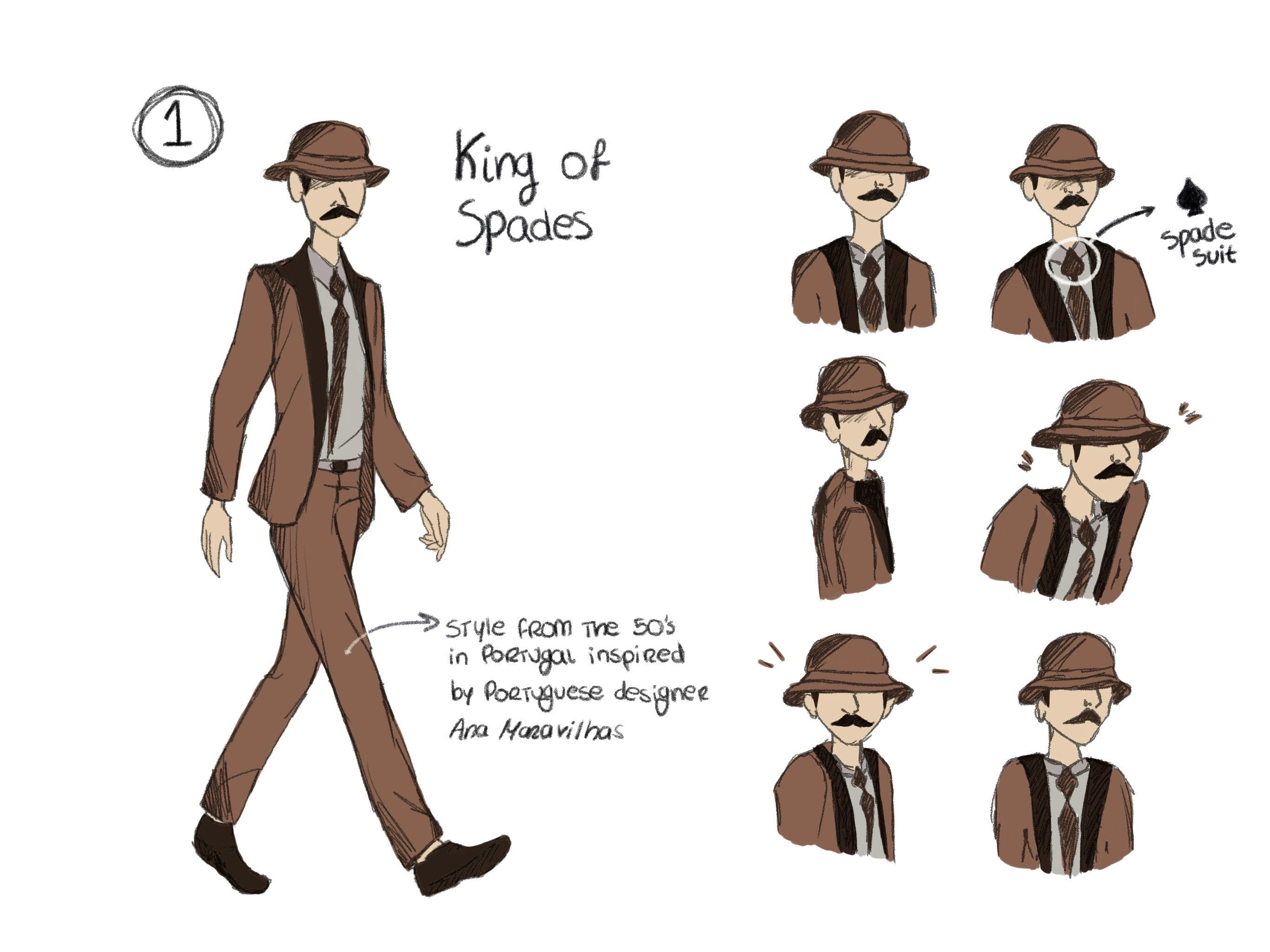 This animation features a total of 6 different characters, each of them carefully thougth out. One main characteristic all of them share, is the fact that they have no face, in order to represent not just their actual persona, but a group of people, allowing the audience to relate to the plot easier. The King (of Spades), the Queen (of Hearts) and the 2 men on the train, for instance, represent the Portuguese people and the desire for freedom, while the Jack (of Clubs) and the PIDE police represent the regime.