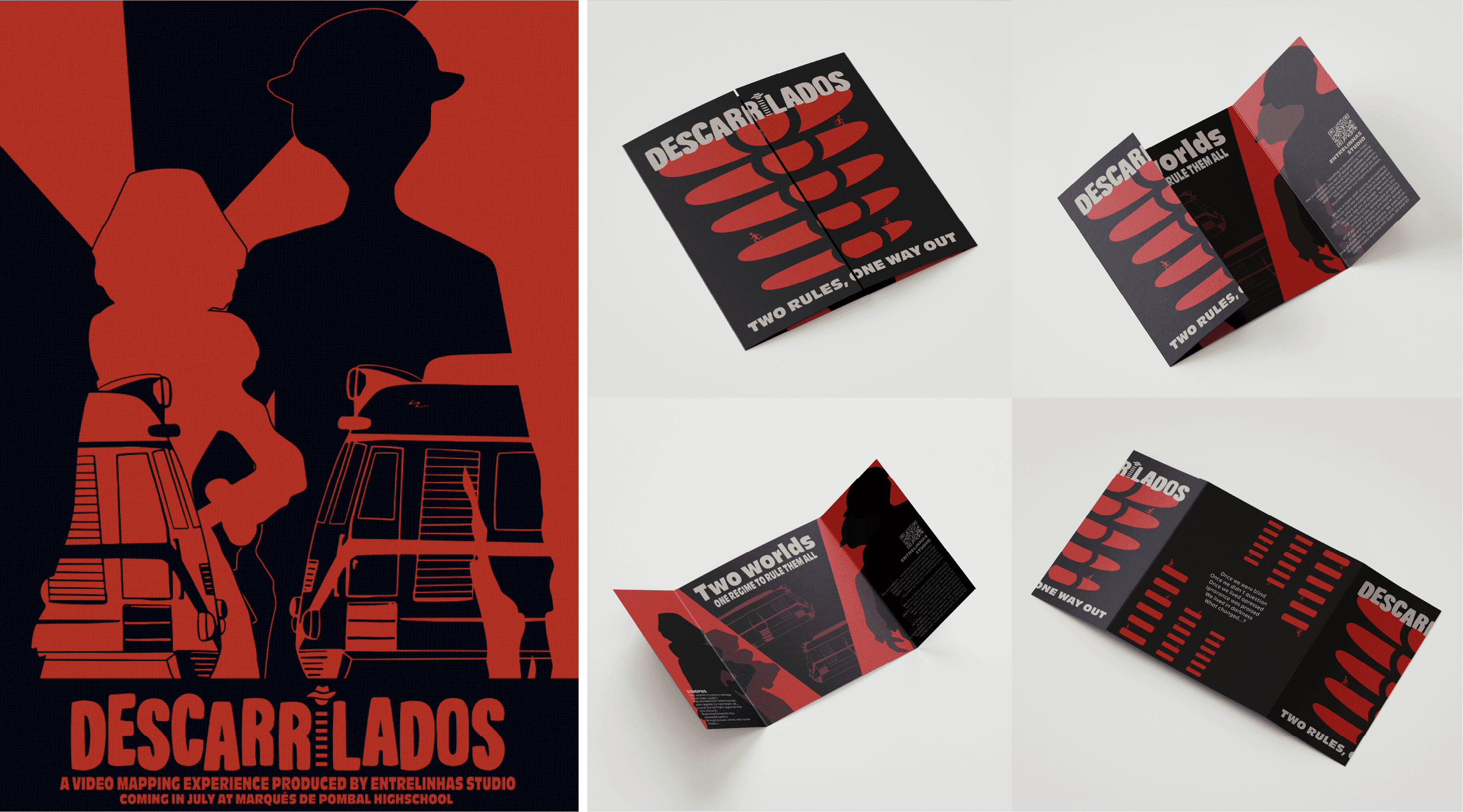 Descarrilados was a team project exhibited at Escola Secundária Marquês de Pombal, as part of a 25th of April celebration, marking the 50th year of the Portuguese Revolution. The story focuses on showcasing the life of Portuguese people under the conservative regime of António de Oliveira Salazar, in a less serious tone and with some fantasy to it, adressing some of the prohibitions at the time that would be ridiculous nowadays, like how it was forbidden to play cards on trains, kiss in public and be seen in groups.